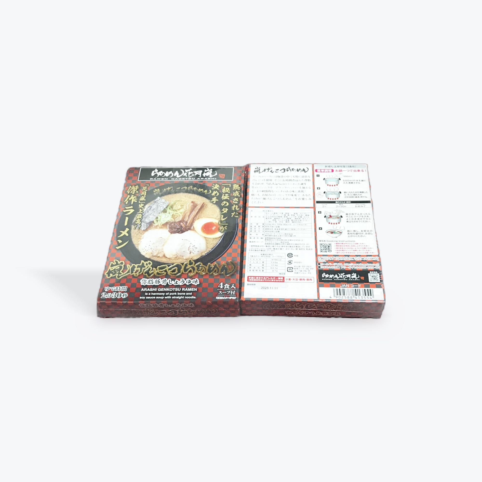 花月嵐の代表的な一品、背脂豚骨醤油ラーメンを手軽にご自宅で楽しめる4食入り2個セットです。濃厚な豚骨スープに、特製の背脂が溶け込み、深い旨味と芳醇な香りを醸し出します。もっちりとした中太麺は、スープとの相性抜群で、本場の味わいを忠実に再現しています。トッピングには、味付け半熟卵、チャーシュー、メンマなどが含まれており、店舗で食べる本格的な一杯を簡単に作ることができます。各パックには調理手順が詳しく記載されており、初めての方でも失敗なく美味しく作れます。保存にも便利な個包装で、急な食事時にも重宝します。豚骨スープのコクと背脂の風味が絶妙なバランスで調和した、まさに専門店クオリティのラーメンをご家庭で。