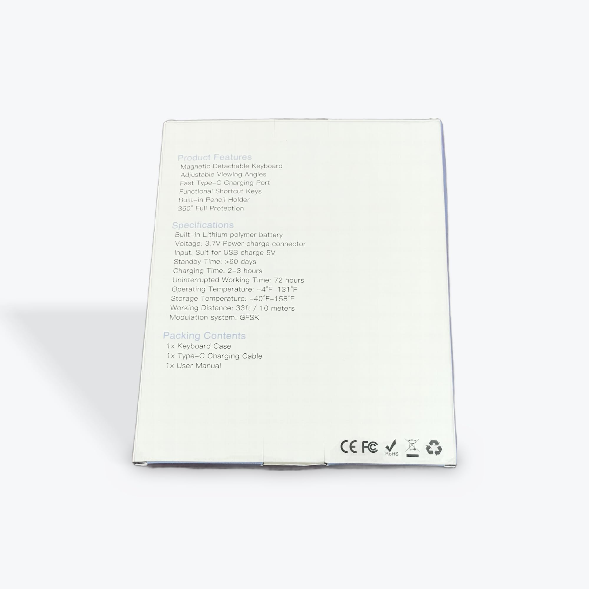 この無線キーボードケースは、超携帯性の高いラップトップに早変わりします。取り外し可能なキーボードと調節可能な視野角度により、どこでも快適に作業できます。充電式リチウムポリマーバッテリーが内蔵されており、最大72時間の連続使用が可能です。スタンバイ時間は最大360日です。軽量でコンパクトなデザインで、持ち運びも簡単です。Type-C充電ケーブルとユーザーマニュアルが付属しています。寸法や重量などの詳細な製品仕様は画像をご確認ください。