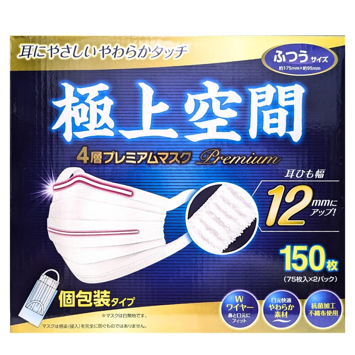 極上空間 プレミアム マスク ふつうサイズ 150 枚 耳にやさしい4層プレミアム 不織布 マスク 抗菌・防臭機能付きで快適な着用感 個包装で清潔に保管できます 150枚入りでお買い得 JIS適合の安心品質。