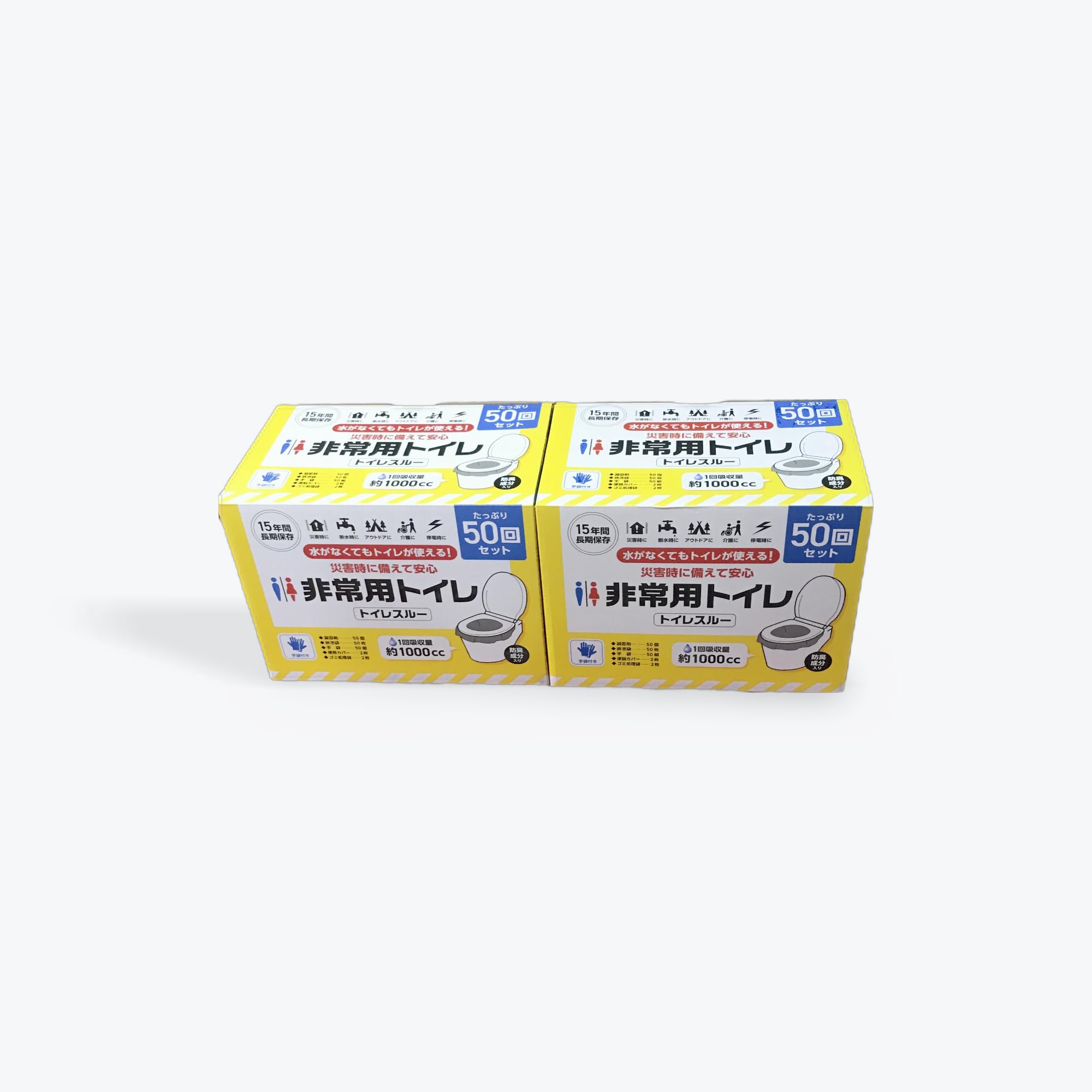 災害時やアウトドアの必需品、この非常用トイレセットは50回分が2箱セットになっており、万が一の事態に備えて安心です。15年の長期保存が可能で、1回あたり約1000ccの容量があり、実用的な設計となっています。簡単な手順で使用でき、水を使わずに処理できる便利な携帯トイレです。自宅での備蓄はもちろん、車載用や避難所、キャンプなどでも重宝します。コンパクトなパッケージながら、50回分×2箱で計100回使用可能という十分な容量を確保。災害時の不安を軽減する必需品として、ご家庭や職場に1セット備えておくことをお勧めします。各種アイコンで用途が分かりやすく表示されており、緊急時でもスムーズに使用できます。